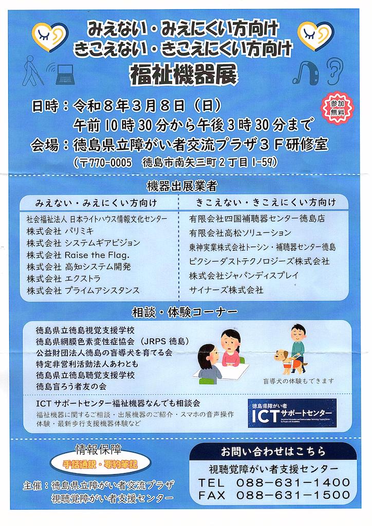 徳島県立障がい者交流プラザ、視聴覚障がい者支援センター主催の「福祉機器展」が開催されます。