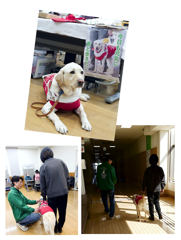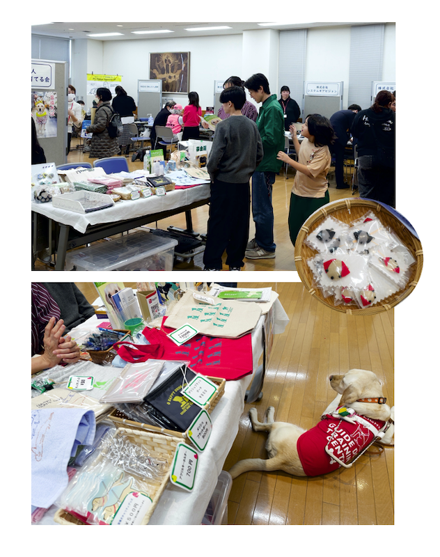 大阪の日本ライトハウス盲導犬訓練所から盲導犬歩行指導員とデモ犬(オリナ君)が来てくれて、視覚障がいのある方や関係者の方も特別に、盲導犬歩行を体験していただきました。当会と日本ライトハウスのチャリティグッズもみなさん手に取っていただき、ありがとうございました。